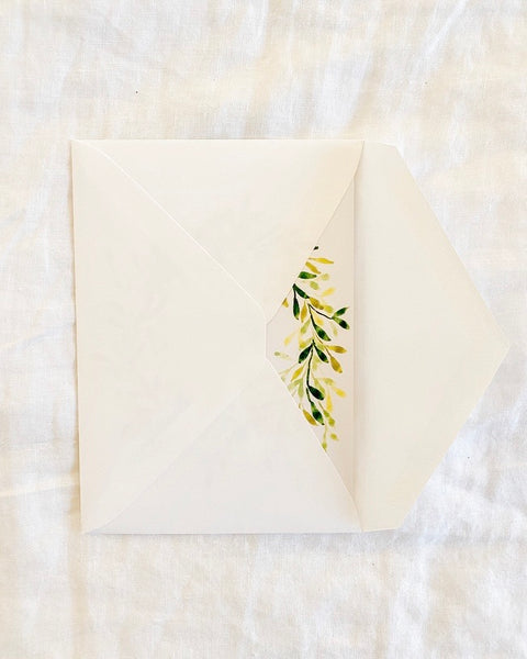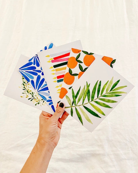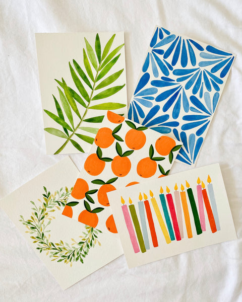 Pack of 5 greeting cards with white envelopes. Set includes 5 different designs: wreath, oranges, blue abstract, birthday candles, and palm leaf. Cards are blank on the inside and size is 5x7”